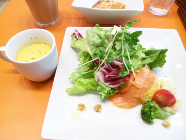 スモークサーモンとカボチャサラダにカボチャスープ